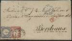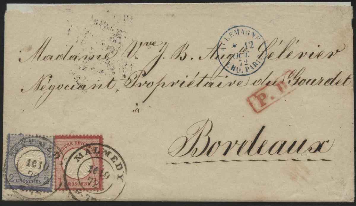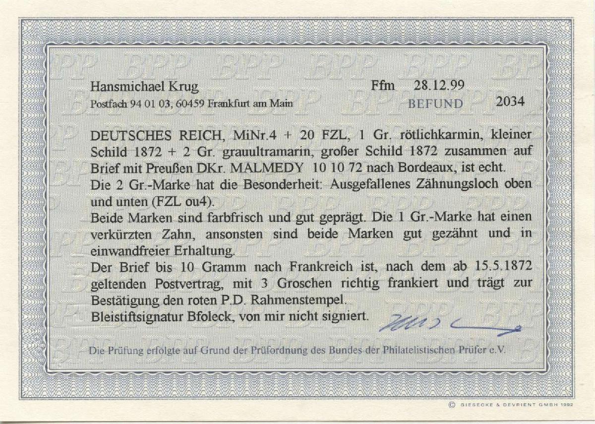 | Zusatzinformationen und Suchstichworte: | 8. Tiergarten Briefmarken und Münzen Auktion Auktionstermin: 01. Juli 2022 Los 159 Deutsches Reich, 1872 Kleiner Brustschild 1872, 1 Gr. rötlichkarmin kleiner Schild und 2 Gr. grauultramarin großer Schild zusammen auf portogerechtem Brief von Malmedy nach Bordeaux. 2 Gr. mit ausgefallenem Zahnloch oben und unten (FZL ou4). Fotobefund Krug BPP Ausruf 110,00 EUR |