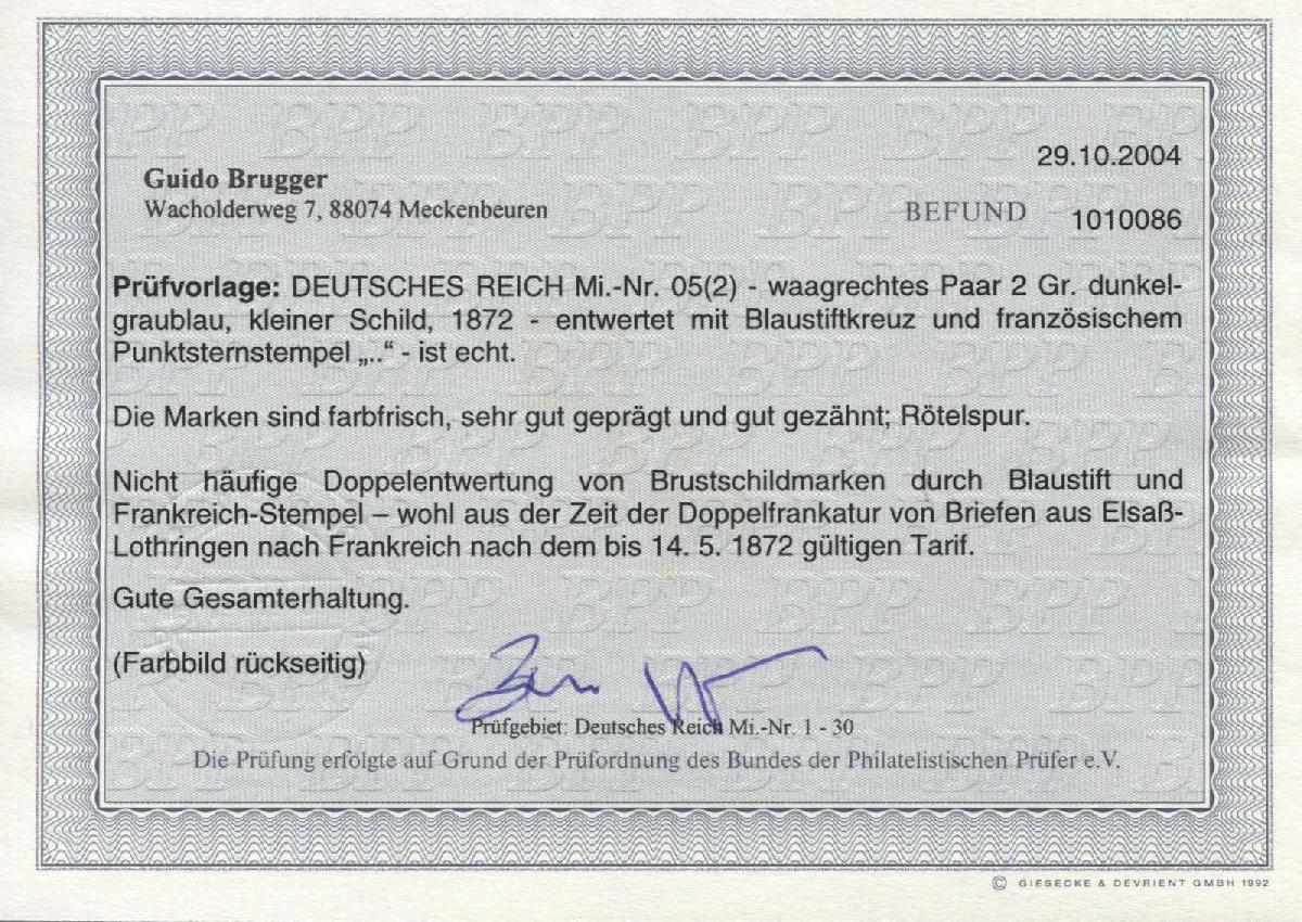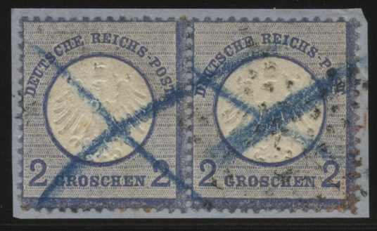 | Zusatzinformationen und Suchstichworte: | 8. Tiergarten Briefmarken und Münzen Auktion Auktionstermin: 01. Juli 2022 Los 164 Deutsches Reich, 1872 Kleiner Brustschild 2 Groschen blau, waagerechtes Paar mit Blaustiftkreuz und franz. Punktsternstempel entwertet, nicht häufige Doppelentwertung, gute Gesamterhaltung, Fotobefunf Brugger BPP Ausruf 80,00 EUR |