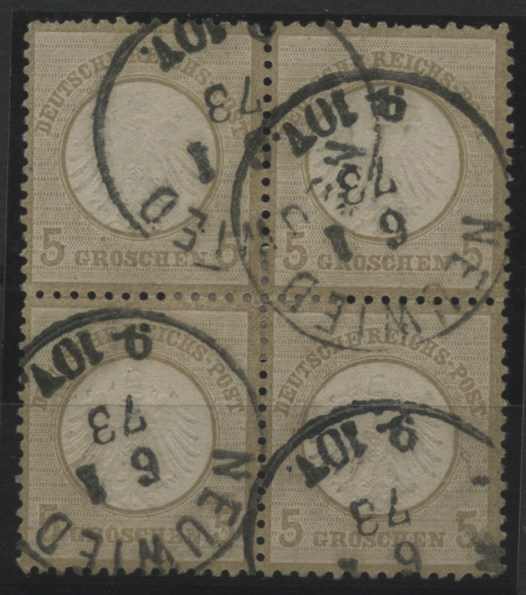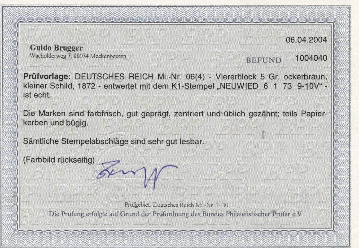 | Zusatzinformationen und Suchstichworte: | 8. Tiergarten Briefmarken und Münzen Auktion Auktionstermin: 01. Juli 2022 Los 175 Deutsches Reich, 1872 Kleiner Brustschild 5 Groschen ockerbraun, Viererblock von Neuwied, die Marken sind farbfrisch, gut geprägt, zentriert und üblich gezähnt, teils kleine Beanstandungen, Fotobefund Brugger BPP Ausruf 200,00 EUR |