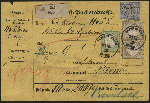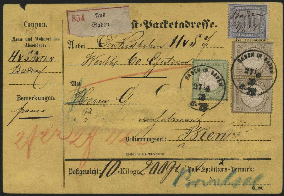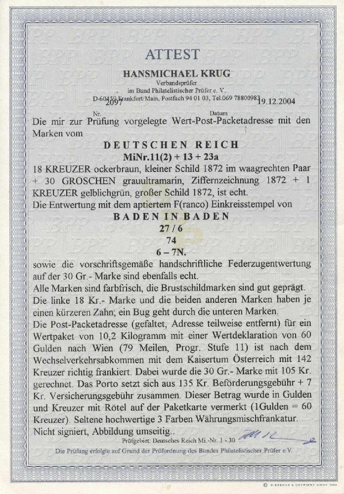 | Zusatzinformationen und Suchstichworte: | 8. Tiergarten Briefmarken und Münzen Auktion Auktionstermin: 01. Juli 2022 Los 194 Deutsches Reich, 1872 Grosser Brustschild 18 Kreuzer ockerbraun Kleiner Adler als waagerechtes Paar zusammen mit 30 Groschen Ziffer blau in 3 Farben Währungsmischfrankatur mit 1 Kreuzer gelblichgrün Großer Adler auf portogerechter Wert-Post-Packetadresse von Baden in Baden nach Wien. Alle Marken sind farbfrisch und gut geprägt. Die linke 18 Kr. und die beiden unteren Marken haben je einen kürzeren Zahn, bedingt durch die Faltung des Beleges geht ein Bug durch die unteren Marken, die Adresse wurde teilweise entfernt, dennoch eine seltene und hochwertige Frankatur! Fotoattest Krug BPP Ausruf 1.700,00 EUR |