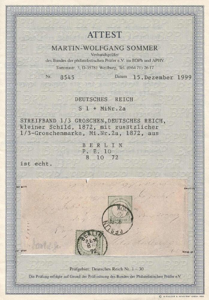 | Zusatzinformationen und Suchstichworte: | 8. Tiergarten Briefmarken und Münzen Auktion Auktionstermin: 01. Juli 2022 Los 140 Deutsches Reich 1/3 Groschen grün als Zusatzfrankatur auf komplettem Streifband von Berlin nach Magdeburg, die Marke ist farbfrisch, klar geprägt, durch Randklebung ist die Zähnung links minimal tangiert. Ganzsachen dieser Ausgabe sind mit Zusatzfrankatur der gleichen Wertstufe sehr selten - kleine Unebenheiten spielen keine dominierende Rolle. Geprüft Hennies BPP und Fotoattest Sommer BPP Ausruf 700,00 EUR |