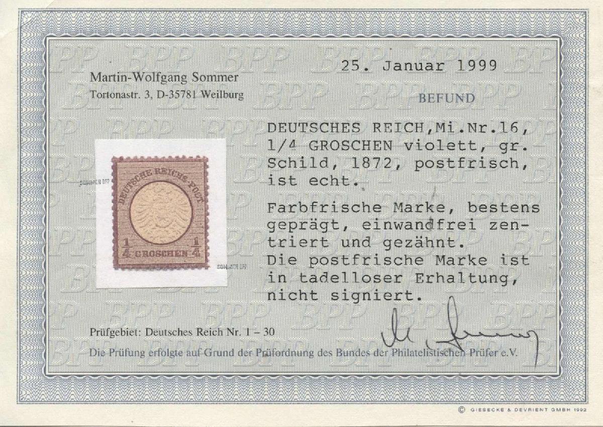 | Zusatzinformationen und Suchstichworte: | 8. Tiergarten Briefmarken und Münzen Auktion Auktionstermin: 01. Juli 2022 Los 209 Deutsches Reich, 1872 Grosser Brustschild 1/4 Groschen violett, farbfrische Marke, bestens geprägt, einwandfrei zentriert und gezähnt, ohne Signatur, Fotobefund Sommer BPP Zuschlag 120,00 EUR |