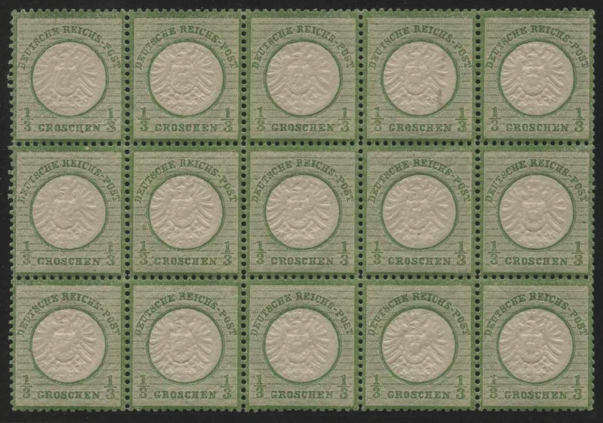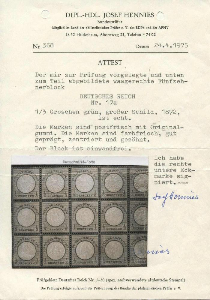 | Zusatzinformationen und Suchstichworte: | 8. Tiergarten Briefmarken und Münzen Auktion Auktionstermin: 01. Juli 2022 Los 215 Deutsches Reich, 1872 Grosser Brustschild 1/3 Groschen gelbgrün, waagerechter Luxus - Fünfzehnerblock, farbfrisch, gut geprägt, zentriert und gezähnt, einwandfreie Ausnahmeerhaltung, untere rechte Marke signiert und Fotoattest Hennies BPP Ausruf 2.200,00 EUR |