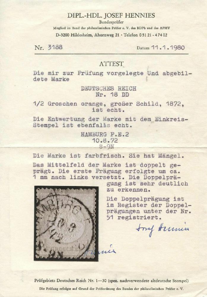 | Zusatzinformationen und Suchstichworte: | 8. Tiergarten Briefmarken und Münzen Auktion Auktionstermin: 01. Juli 2022 Los 234 Deutsches Reich, 1872 Grosser Brustschild 1/2 Groschen orange, DOPPELPRÄGUNG, die erste Prägung ist um ca. 1mm nach links versetzt, deutlich zu erkennen. Die Marke ist farbfrisch, ansonsten weist sie Mängel auf. Im Register der Doppelprägungen unter der Nr. 51 registriert. Fotoattest Hennies BPP Ausruf 300,00 EUR |