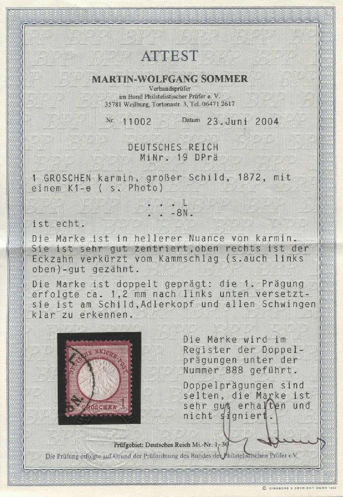 | Zusatzinformationen und Suchstichworte: | 8. Tiergarten Briefmarken und Münzen Auktion Auktionstermin: 01. Juli 2022 Los 258 Deutsches Reich, 1872 Grosser Brustschild 1 Groschen karmin, deutliche DOPPELPRÄGUNG des Mittelstücks, Marke sehr gut zentriert und gut gezähnt, Registernummer 888, die Marke ist insgesamt sehr gut erhalten, Fotoattest Sommer BPP Ausruf 200,00 EUR |
