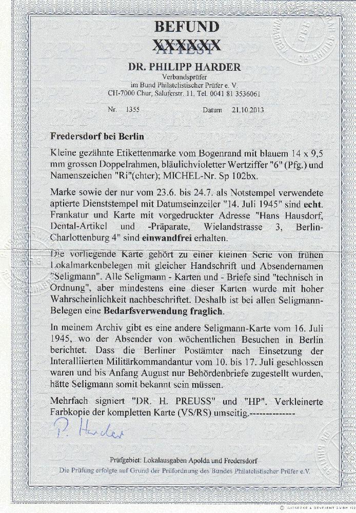 | Prüfgebiet: | Deutsche Lokalausgaben 1945 Fredersdorf |