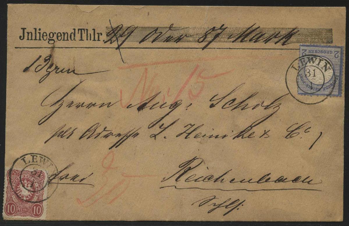 | Zusatzinformationen und Suchstichworte: | 8. Tiergarten Briefmarken und Münzen Auktion Auktionstermin: 01. Juli 2022 Los 267 Deutsches Reich, 1875 Pfennige Wertbrief mit seltener Mischfrankatur 2 Gr. blau Großer Brustschild mit 10 Pfge. karmin Adler, portogerecht und tadellos erhalten, entwertet mit nachverwendetem Preußen-Stempel Lewin 31.1., Befund Sommer BPP Ausruf 220,00 EUR |