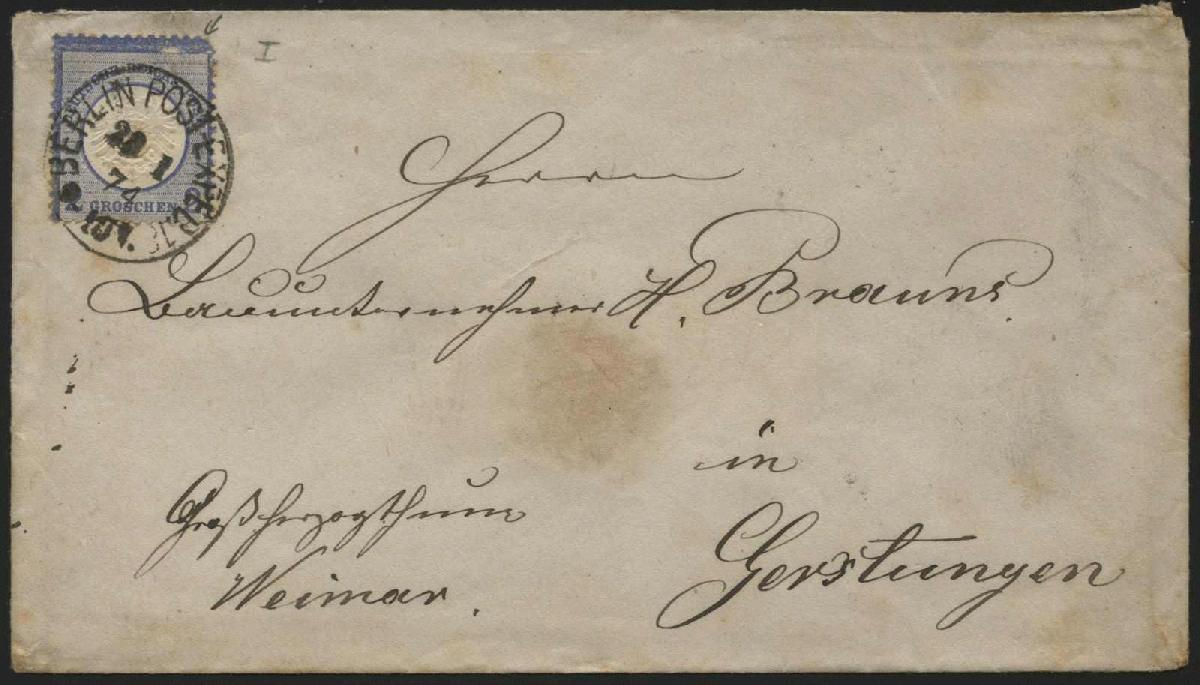 | Zusatzinformationen und Suchstichworte: | 8. Tiergarten Briefmarken und Münzen Auktion Auktionstermin: 01. Juli 2022 Los 269 Deutsches Reich, 1872 Grosser Brustschild 2 Groschen blau, Plattenfehler I, bis auf kleinen Eckzahnfehler oben rechts gut erhalten, gesiegelter, portogerechter Brief von Berlin nach Gerstungen, Ankunftsstempel, Fotobefund Sommer BPP Ausruf 150,00 EUR |