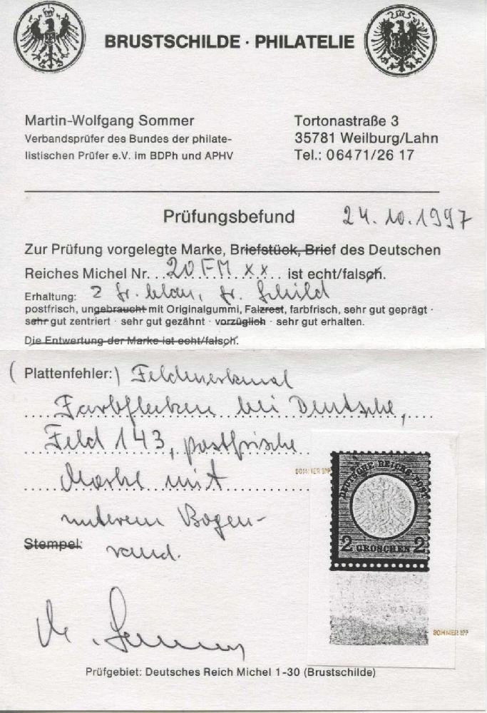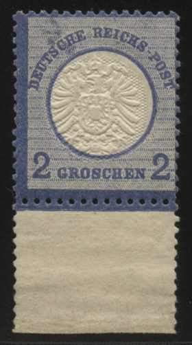 | Zusatzinformationen und Suchstichworte: | 8. Tiergarten Briefmarken und Münzen Auktion Auktionstermin: 01. Juli 2022 Los 270 Deutsches Reich, 1872 Grosser Brustschild 2 Groschen blau, farbfrisches Kabinettstück vom Unterrand mit Feldmerkmal " Farbflecken bei Deutsche " Feld 143, Fotobefund Sommer BPP Ausruf 80,00 EUR |