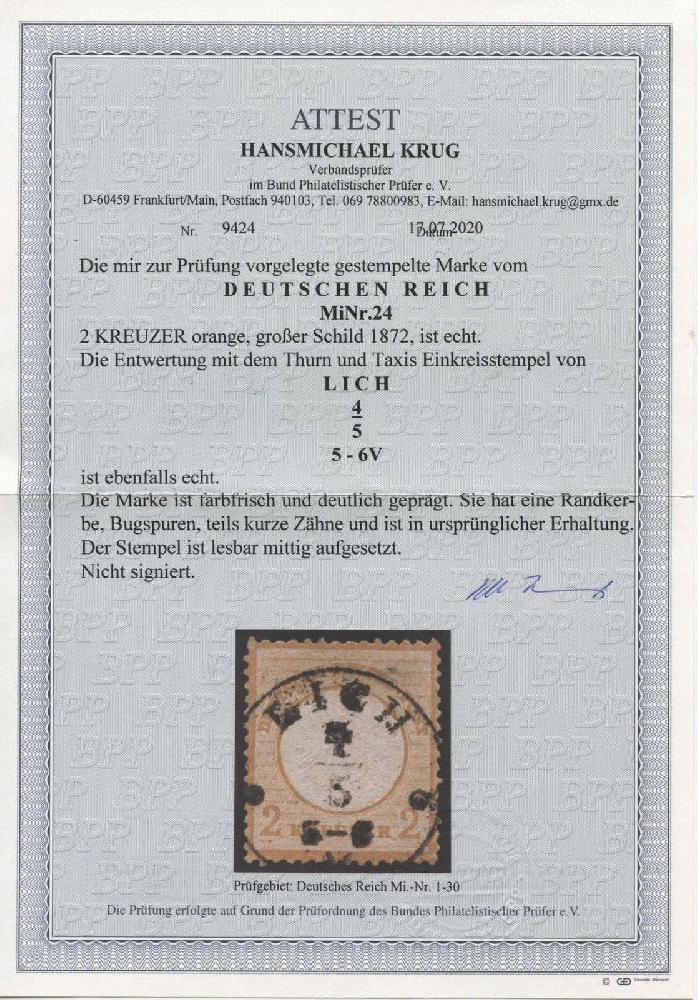 | Zusatzinformationen und Suchstichworte: | 8. Tiergarten Briefmarken und Münzen Auktion Auktionstermin: 01. Juli 2022 Los 301 Deutsches Reich, 1872 Grosser Brustschild 2 Kr. orange, Bedarfsstück mit kleinen Beanstandungen, in ursprünglicher Erhaltung, Fotoattest Krug BPP Ausruf 550,00 EUR |