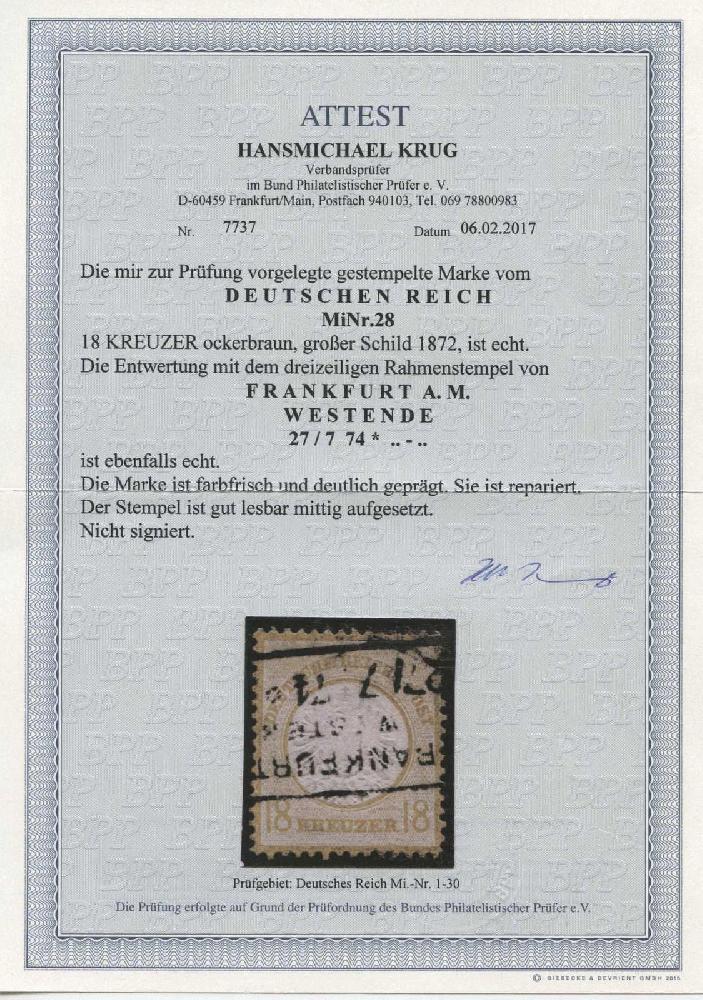 | Zusatzinformationen und Suchstichworte: | 8. Tiergarten Briefmarken und Münzen Auktion Auktionstermin: 01. Juli 2022 Los 324 Deutsches Reich, 1872 Grosser Brustschild 18 Kreuzer ockerbraun, großer Schild mit Rahmenstempel von " Frankfurt a. M. Westende 27.7.74 ". Die Marke ist farbfrisch und deutlich geprägt, aber repariert. Schönes Belegstück, Fotoattest Krug BPP Ausruf 220,00 EUR |