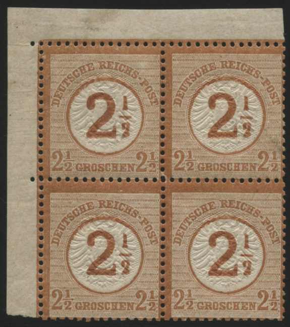 | Zusatzinformationen und Suchstichworte: | 8. Tiergarten Briefmarken und Münzen Auktion Auktionstermin: 01. Juli 2022 Los 326 Deutsches Reich, 1872 Grosser Brustschild 2 1/2 a. 2 1/2 Groschen braun, postfrischer Viererblock aus der Bogenecke - er hat noch einen Teil vom linken und oberen Bogenrand, in kräftiger Farbe, hervorragend geprägt, in einwandfreier Zähnung, tadellos erhalten. Fotoattest Sommer BPP Ausruf 400,00 EUR |