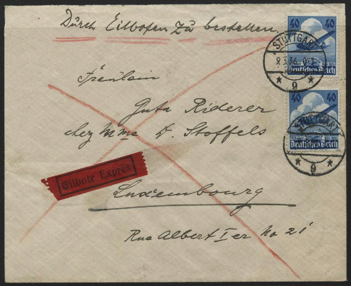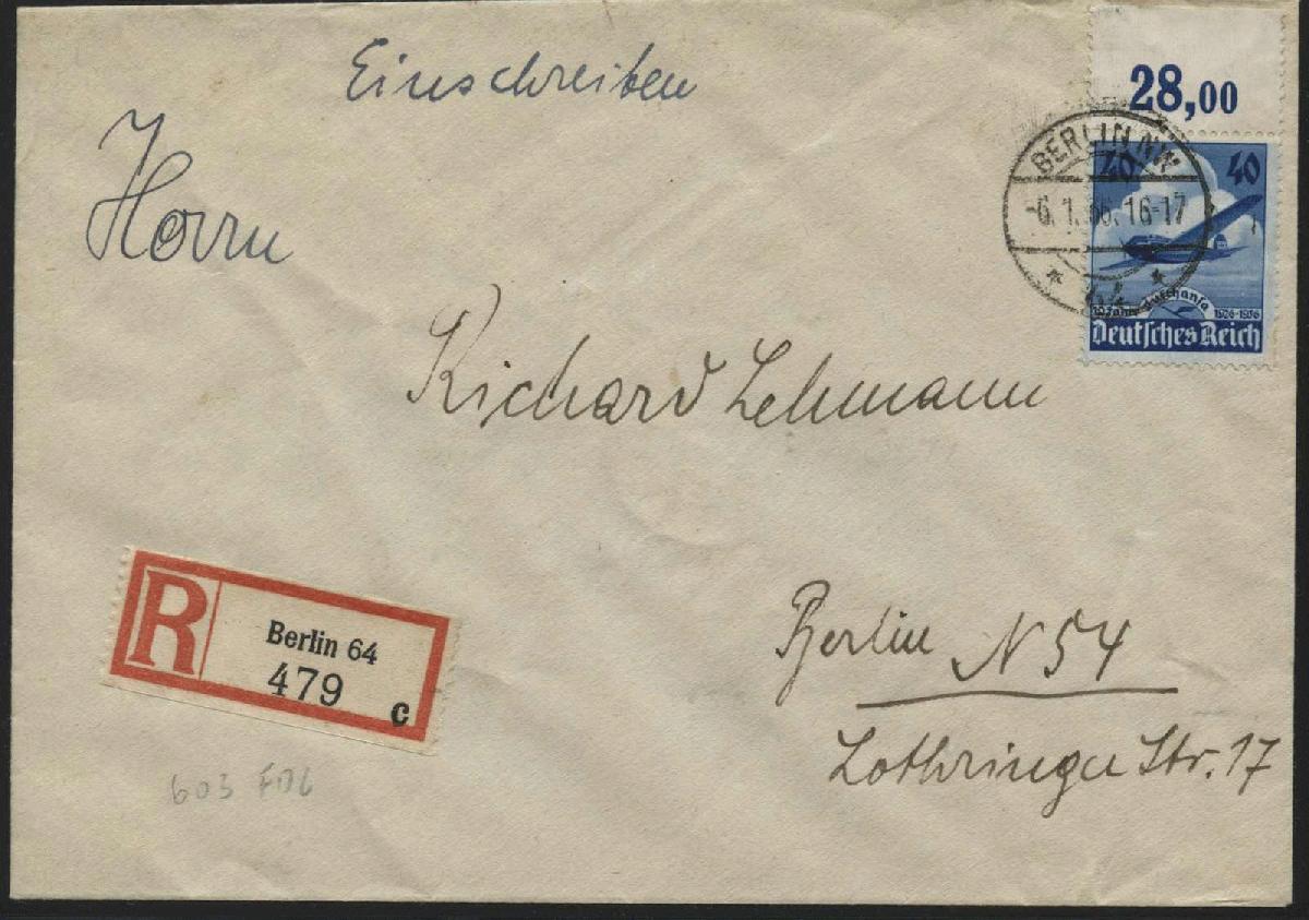 | Zusatzinformationen und Suchstichworte: | 8. Tiergarten Briefmarken und Münzen Auktion Auktionstermin: 01. Juli 2022 Los 370 Deutsches Reich, 1933/45 Drittes Reich 1936, kleines Lot von Mi.-Nr. 603, dabei Einzelfrankatur vom Oberrrand auf FDC-Einschreibe-Ortsbrief mit Kurzbefund Schlegel, Mehrfachfrankatur (2) auf Eilbotenbrief (nicht portogerecht) Ausruf 60,00 EUR |