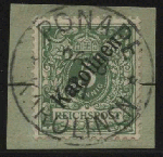 | Zusatzinformationen und Suchstichworte: | 8. Tiergarten Briefmarken und Münzen Auktion Auktionstermin: 01. Juli 2022 Los 444 Deutsche Kolonien Karolinen 1899, 5 Pf. opalgrün, diagonaler Aufdruck, kopfstehende Monatsangabe im " Ponape 26/8 01 ". Die Marke, mit Falz auf dem dazugehörigem Briefstück befestigt, ist farbfrisch, gut gezähnt und befindet sich in fehlerfreier Erhaltung. Altsignatur Kossak und Fotoattest Jäschke-L. BPP Ausruf 200,00 EUR |