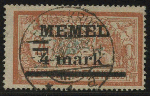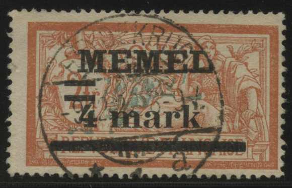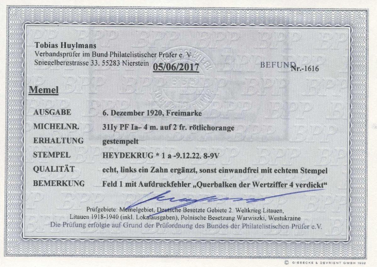 | Zusatzinformationen und Suchstichworte: | 8. Tiergarten Briefmarken und Münzen Auktion Auktionstermin: 01. Juli 2022 Los 451 Memel 1920, 4 m. auf 2 fr. Freimarke mit Plattenfehler, echt gestempelt Heydekrug, links ein Zahn ergänzt, sonst einwandfrei, Fotobefund Huylmans BPP Ausruf 50,00 EUR |