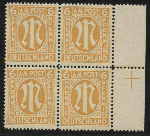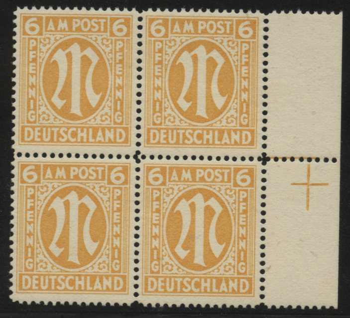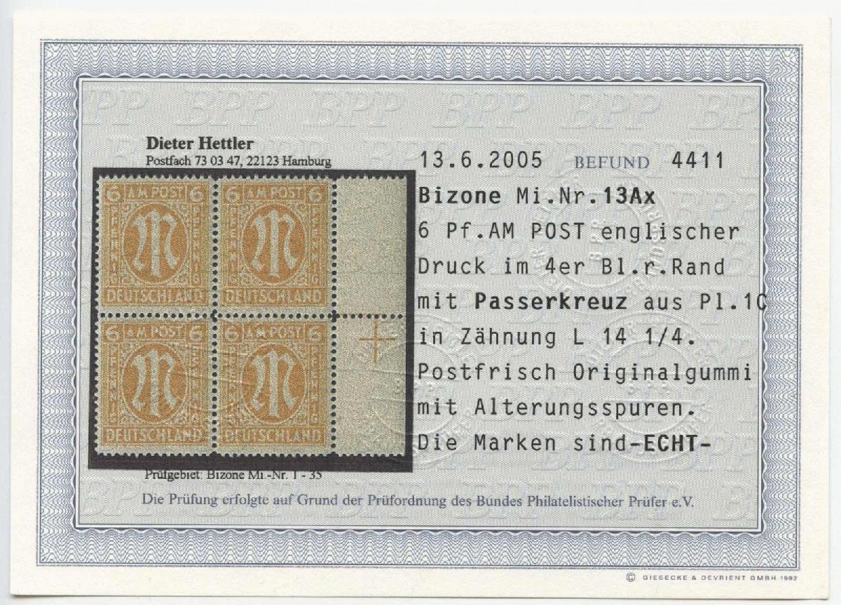| Zusatzinformationen und Suchstichworte: | 8. Tiergarten Briefmarken und Münzen Auktion Auktionstermin: 01. Juli 2022 Los 489 Bizone AM POST 6 Pf. englischer Druck, Zähnung L 14 1/4, Rand-Viererblock mit Passerkreuz, Originalgummi mit kaum erkennbaren Alterungsspuren lt. Fotobefund Hettler BPP Ausruf 20,00 EUR |