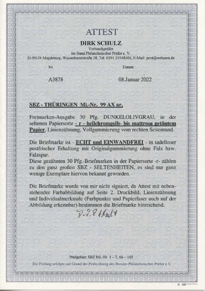 | Zusatzinformationen und Suchstichworte: | 8. Tiergarten Briefmarken und Münzen Auktion Auktionstermin: 01. Juli 2022 Los 573 SBZ Thüringen 30 Pfg. dunkelolivgrau in der seltenen Papiersorte - r - hellchromgelb- bis mattrosa getöntem Papier, Linienzähnung und Vollgummi. Kabinettstück dieser ganz großen SBZ - Seltenheit, es sind nur ganz wenige Exemplare hiervon bekannt geworden, neuestes Fotoattest Schulz BPP Zuschlag 1.000,00 EUR |
