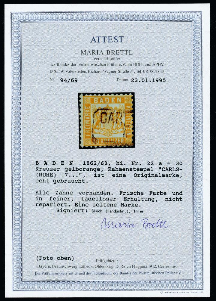 | Zusatzinformationen und Suchstichworte: | Klüttermann - 4. Auktion Auktionstermin: 28. Juli - 5. August 2022 Los 154 Altdeutschland Baden 30 Kreuzer gelborange, Luxusstück mit sauberem Ra2 CARLSRUHE, FA Brettl, in tadelloser Erhaltung eine sehr seltene Marke Katalogwert: 3000 Ausruf 1.400,00 EUR |