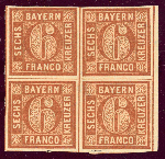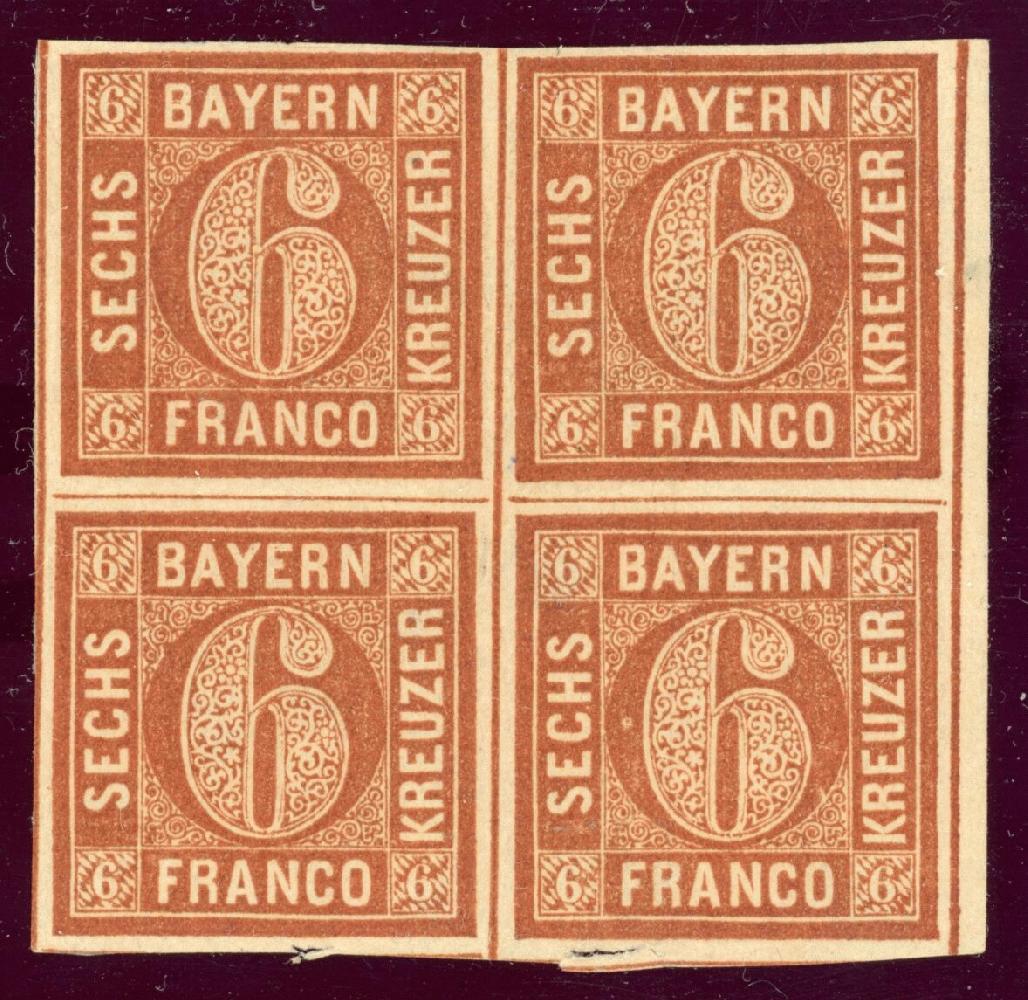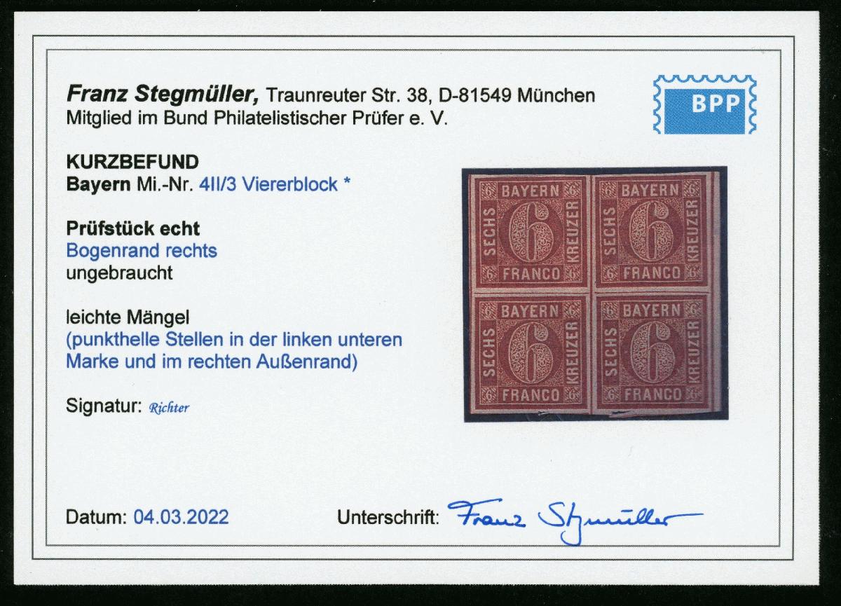 | Zusatzinformationen und Suchstichworte: | Klüttermann - 4. Auktion Auktionstermin: 28. Juli - 5. August 2022 Los 249 Altdeutschland Bayern 6 Kr. braun Type II Pl. 3 im ungebr. breitrd. 4erBlock, punkthelle Stelle in der linken unteren Marke und im rechten Außenrand, KB Stegmüller Zuschlag 150,00 EUR |