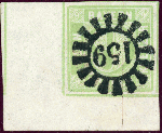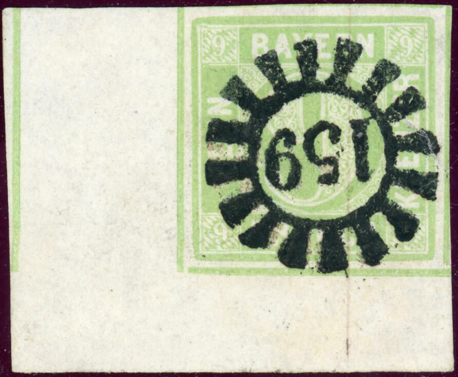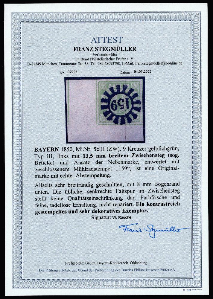 | Zusatzinformationen und Suchstichworte: | Klüttermann - 4. Auktion Auktionstermin: 28. Juli - 5. August 2022 Los 259 Altdeutschland Bayern 9 Kreuzer gelblichgrün links mit 13,5mm Zwischenstegansatz un voller linker Trennlinie sowie breitem unteren Bogenrand von 8 mm, glasklarer gMR 159, tolles allseits sehr breitrandig geschnittenes Luxusstück mit FA Stegmüller (2022), Schaustück für die große Sammlung Zuschlag 1.650,00 EUR |