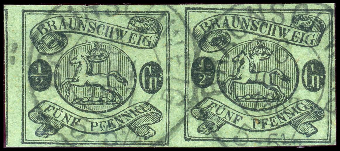 | Zusatzinformationen und Suchstichworte: | Klüttermann - 4. Auktion Auktionstermin: 28. Juli - 5. August 2022 Los 582 Altdeutschland Braunschweig 1/2 Gr. schwarz/grün dünnes Papier, waager. voll-bis überrandiges Luxuspaar mit 2 sauberen K2 BRAUNSCHWEIG 6.JULI 1867, inter. Abart Klischeeverschiebung, FA Lange Katalogwert: 1200 Ausruf 250,00 EUR |