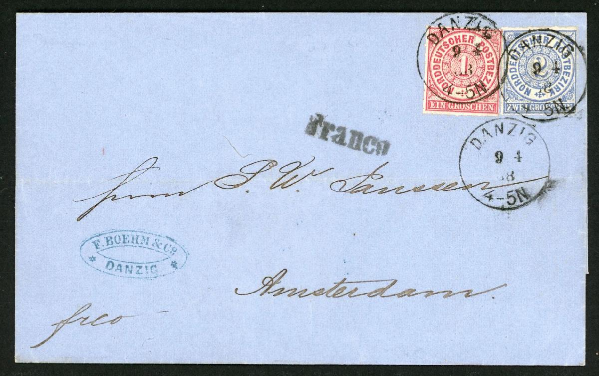 | Zusatzinformationen und Suchstichworte: | Klüttermann - 4. Auktion Auktionstermin: 28. Juli - 5. August 2022 Los 810 Altdeutschland Norddeutscher Postbezirk 1 und 2 Gr. a. Brief mit K1 DANZIG 9 4 68 nach Amsterdam mit L1 Franco, 2 Gr. minim. eckrund, KB Mehlmann Zuschlag 36,00 EUR |