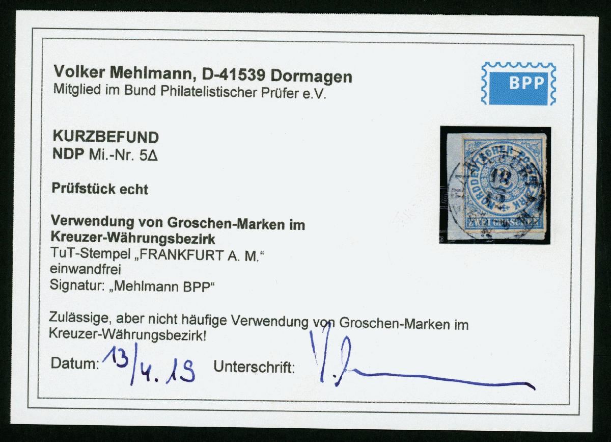 | Zusatzinformationen und Suchstichworte: | Klüttermann - 4. Auktion Auktionstermin: 28. Juli - 5. August 2022 Los 815 Altdeutschland Norddeutscher Postbezirk 2 Gr. als Fremdverwendung im Kreuzerbezirk a. Kab-Bfst. mit K1 FRANKFURT A.M. 13/12, KB Mehlmann Ausruf 35,00 EUR |