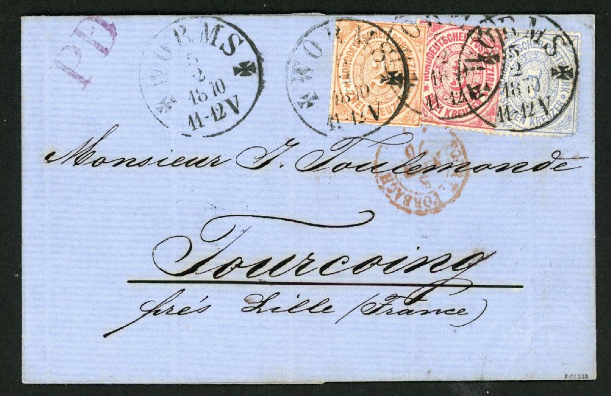 | Zusatzinformationen und Suchstichworte: | Klüttermann - 4. Auktion Auktionstermin: 28. Juli - 5. August 2022 Los 825 Altdeutschland Norddeutscher Postbezirk dekorative Kreuzer Dreifarbenfrankatur auf PD Brief nach Frankreich mit K1 WORMS, Marken kl. Fehler, KB Mehlmann Zuschlag 36,00 EUR |