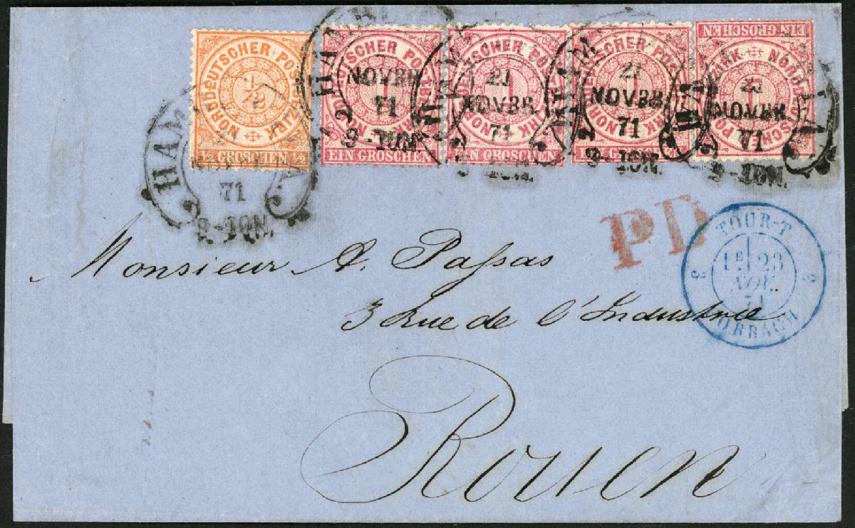 | Zusatzinformationen und Suchstichworte: | Klüttermann - 4. Auktion Auktionstermin: 28. Juli - 5. August 2022 Los 847 Altdeutschland Norddeutscher Postbezirk 1/2 Gr. orange mit 4mal 1 Gr. karmin als dek. MiF auf dek. Reichspostvorläufer PD-Brief mit Huf.-Stempel HAMBURG I.A. 21.NOVBR. 71 nach Rouen in Frankreich, FA Mehlmann, 1 mal 1 Gr. mit einem fehl. Zahn sonst einwandfrei Ausruf 200,00 EUR |