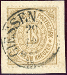 | Zusatzinformationen und Suchstichworte: | Klüttermann - 4. Auktion Auktionstermin: 28. Juli - 5. August 2022 Los 864 Altdeutschland Norddeutscher Postbezirk 18 Kreuzer graubraun auf weißem Luxusbfst. mit sauberem K1 GIESSEN STADT 28/12, FA Mehlmann, einwandfreie Stücke dieser Marken sind selten! Ausruf 1.500,00 EUR |