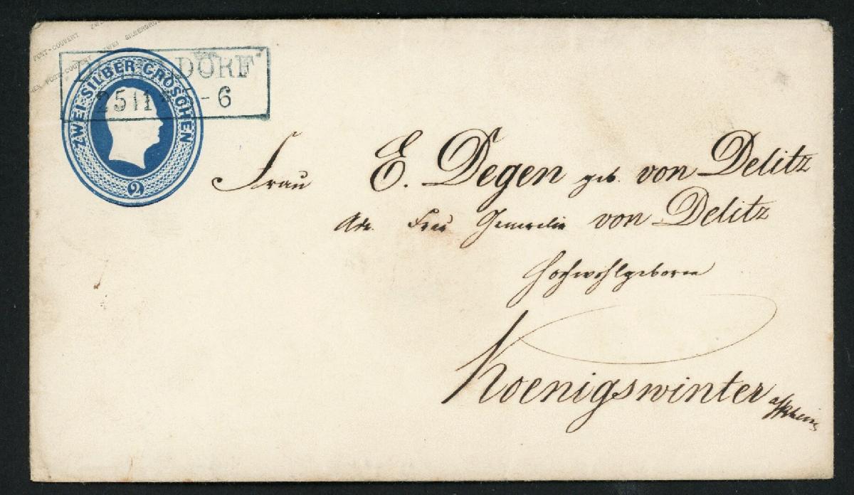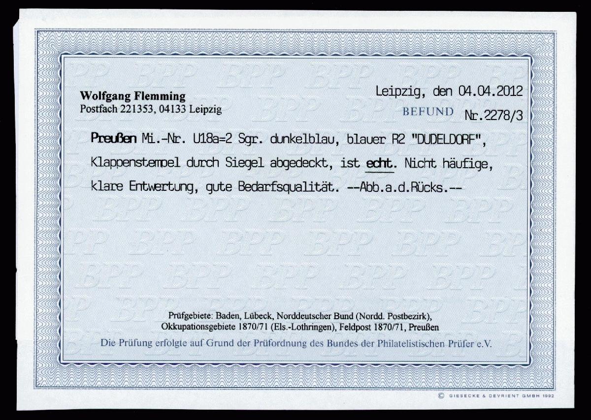 | Zusatzinformationen und Suchstichworte: | Klüttermann - 4. Auktion Auktionstermin: 28. Juli - 5. August 2022 Los 970 Altdeutschland Preussen DUDELDORF, blauer Ra2 a. 2 Sgr. Kopf-GSU, Luxus, FB Flemming Zuschlag 74,00 EUR |