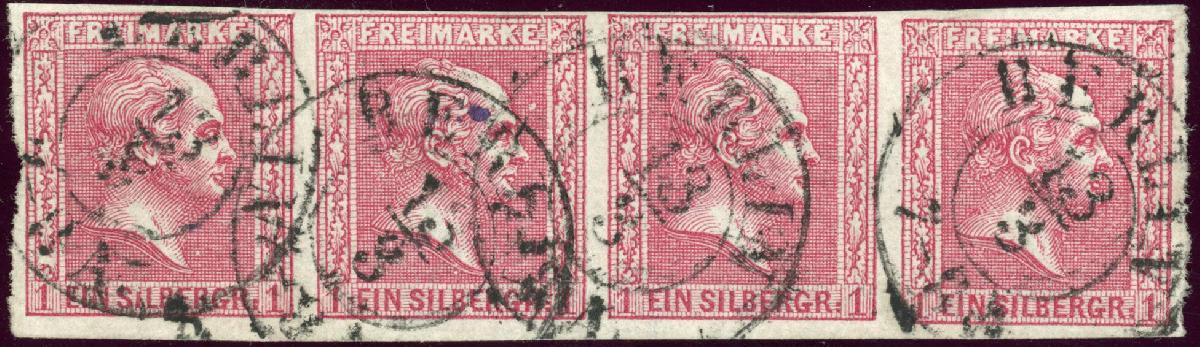 | Zusatzinformationen und Suchstichworte: | Klüttermann - 4. Auktion Auktionstermin: 28. Juli - 5. August 2022 Los 1159 Altdeutschland Preussen 1 Sgr. rosa auf dünnem Papier im waagerechten noch voll- bis breitrandigem Viererstreifen mit zusätzlich Plattenfehler VIII "dickes R" bei der 2ten Marke und 4 mal K2 BERLIN; seltene Einheit mit Kombination Plattenfehler/dünnes Papier, FA Jäschke-L Ausruf 400,00 EUR |