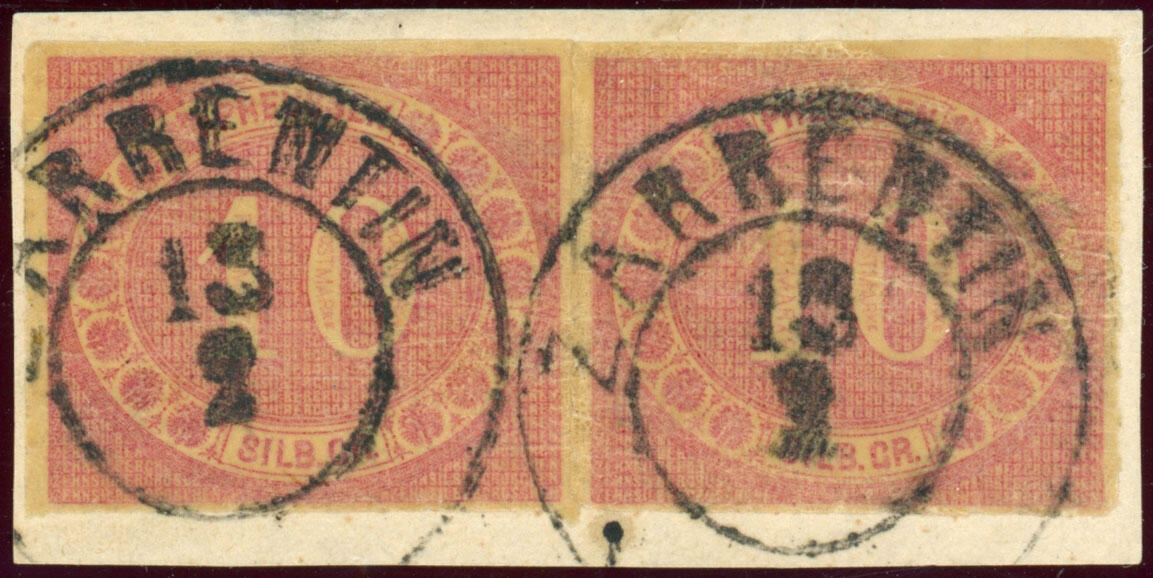 | Zusatzinformationen und Suchstichworte: | Klüttermann - 4. Auktion Auktionstermin: 28. Juli - 5. August 2022 Los 1237 Altdeutschland Preussen 10 Sgr. rosa, waager. Paar auf Bfst. mit MS-K2 ZARRENTIN, kl. Mgl., KB Jäschke-L Zuschlag 72,00 EUR |