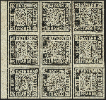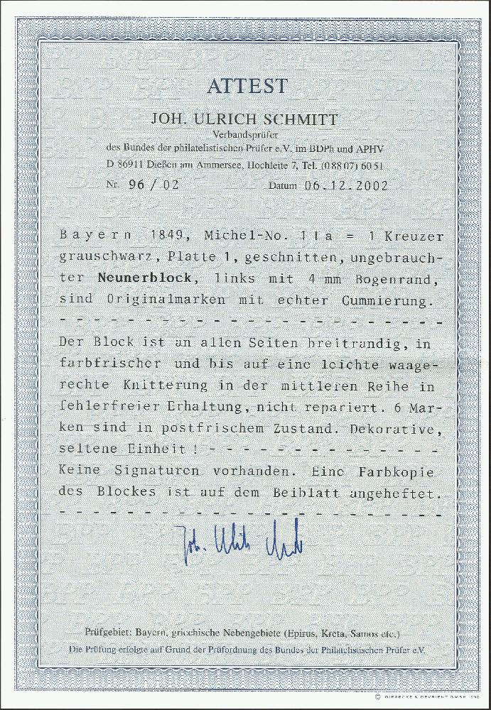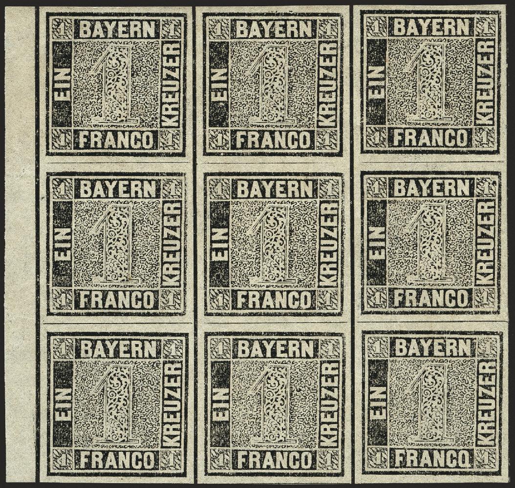 | Zusatzinformationen und Suchstichworte: | 378. Auktion Heinrich Köhler Auktionstermin 21.-26. März 2022 Los 13 1 Kreuzer grauschwarz, Platte 1, im 9er-Block, farbfrisch und allseits breitrandig, links mit ca. 4 mm Bogenrand, ungebraucht mit Originalgummi, sechs Werte postfrisch. Abgesehen von einer minimalen Knitterung in der mittleren waagerechten Reihe in tadelloser Erhaltung. Fotoattest Schmitt BPP (2002) Ausruf 4.000,00 EUR Zuschlag 21.000,00 EUR (aus der Sammlung Erivan Haub) |