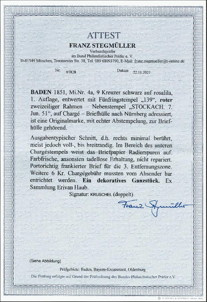 | Zusatzinformationen und Suchstichworte: | 378. Auktion Heinrich Köhler Auktionstermin 21.-26. März 2022 Los 2 9 Kreuzer schwarz auf rosalila, rechts in der Randlinie minimal berührt, sonst voll- bis breitrandig, mit zentrischer Nummer “139“ auf Charge-Briefhülle mit sauber nebengesetztem roten Rahmenstempel “STOCKACH 7. Jun. 51“ nach Nürnberg. Die Hülle zeigt im Bereich des unteren Charge-Stempels unauffällige Radierspuren, sonst tadellos. Ein attraktiver früherer Charge-Brief in den Postverein. Signiert Kruschel und Fotoattest Stegmüller BPP. Ausruf 150,00 EUR Zuschlag 950,00 EUR (aus der Sammlung Erivan Haub) |