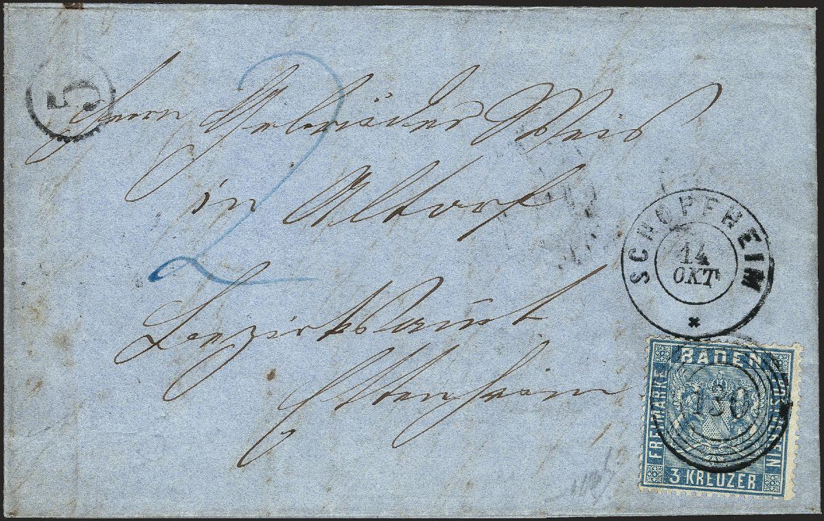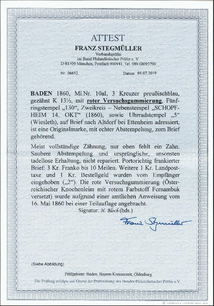 | Zusatzinformationen und Suchstichworte: | 378. Auktion Heinrich Köhler Auktionstermin 21.-26. März 2022 Los 4 1860/62, 3 Kreuzer preußischblau mit roter Versuchsgummierung, farbfrisch und bis auf einen Fehlzahn oben gut gezähnt, mit klar aufgesetzter Nummer “130“ und sauber nebengesetztem Doppelkreisstempel “SCHOPFHEIM 14 OKT“ (1860) sowie Uhrradstempel “5“ (Wiesleth) auf komplettem Faltbrief nach Altdorf bei Ettenheim. Weitere „2“ Kreuzer Landpostporto und -bestellgeld wurden vom Empfänger eingezogen. Ein attraktiver und interessanter Landpostbrief. Signiert Bloch und Fotoattest Stegmüller BPP (2021) Ausruf 400,00 EUR Zuschlag 750,00 EUR (aus der Sammlung Erivan Haub) |
