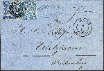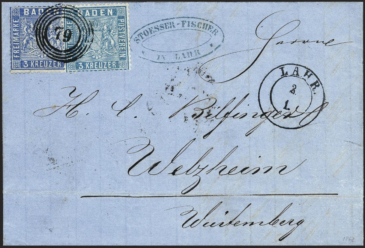 | Zusatzinformationen und Suchstichworte: | 378. Auktion Heinrich Köhler Auktionstermin 21.-26. März 2022 Los 5 1860/61, 3 Kreuzer lebhaftpreußischblau und 3 Kreuzer ultramarin, beide sehr schön farbfrisch, die b-Farbe oben durch Scherentrennung einige verkürzte Zähne, sonst beide einwandfrei, mit zentrisch und klar aufgesetzter Nummer “79“ und nebengesetztem Doppelkreisstempel “LAHR 2. 1.“ auf komplettem Faltbrief nach Welzheim in Württemberg. Der Brief rückseitig etwas urisch, sonst tadellose und sehr schöne Erhaltung. Eine äußerst seltene 'Farbfrankatur'. Qualität-Prüfungsbefund Maria Brettl (1992) und Fotoattest Stegmüller BPP (2021) Ausruf 500,00 EUR Zuschlag 950,00 EUR (aus der Sammlung Erivan Haub) |