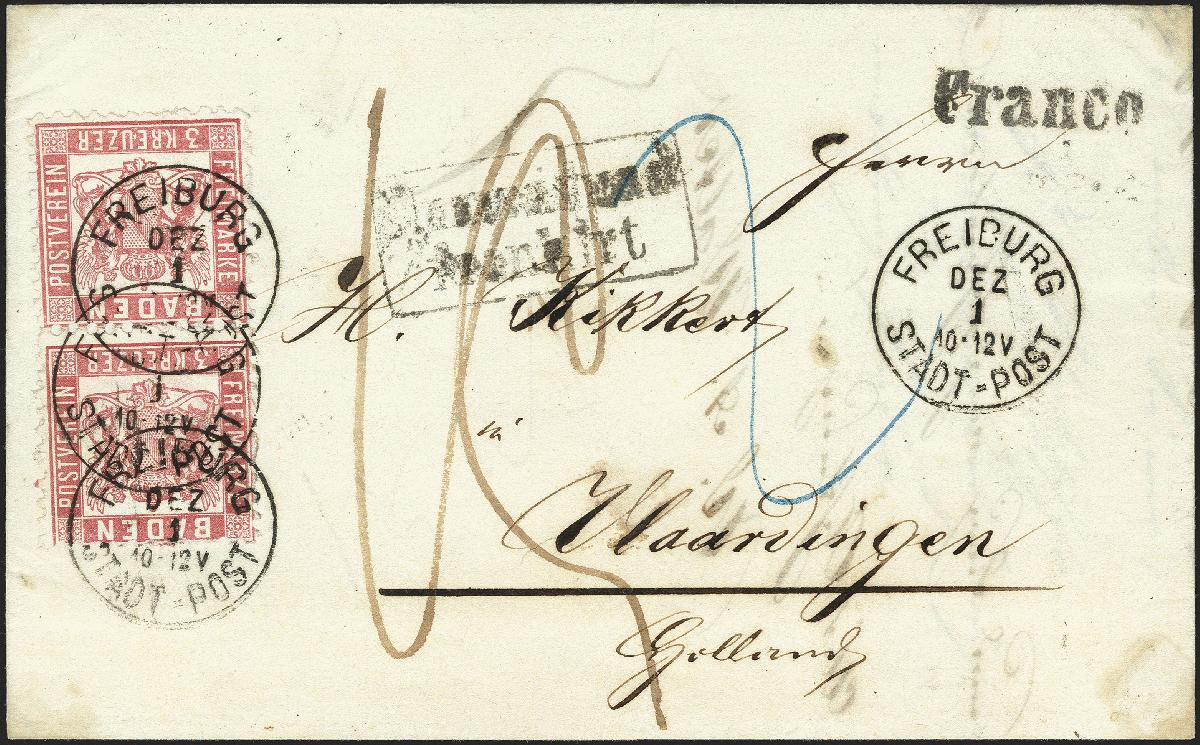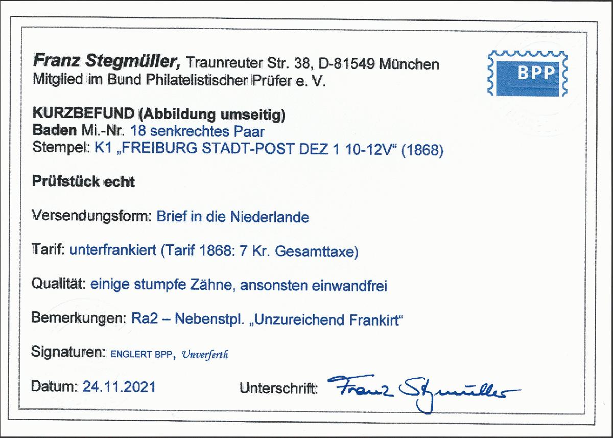 | Zusatzinformationen und Suchstichworte: | 378. Auktion Heinrich Köhler Auktionstermin 21.-26. März 2022 Los 7 3 Kreuzer rosa im senkrechten Paar, farbfrisch und gut gezähnt mit sauber auf- und nebengesetztem Einkreisstempel "FREIBURG STADT-POST DEZ. 1" auf Faltbrief nach Vlaardingen in Holland; um 1 Kreuzer unterfrankiert und nachtaxiert mit nebengesetztem Rahmenstempel "Unzureichend frankirt". Signiert Unverferth und Englert BPP, Kurzbefund Stegmüller BPP Ausruf 80,00 EUR Zuschlag 380,00 EUR (aus der Sammlung Erivan Haub) |