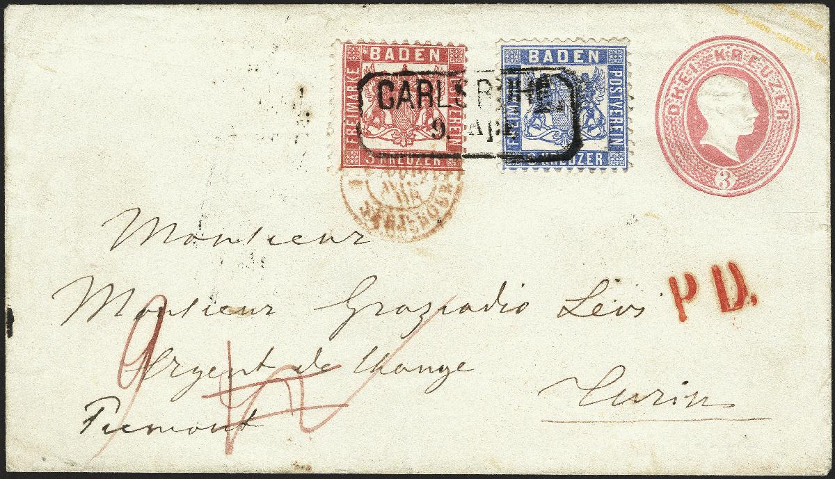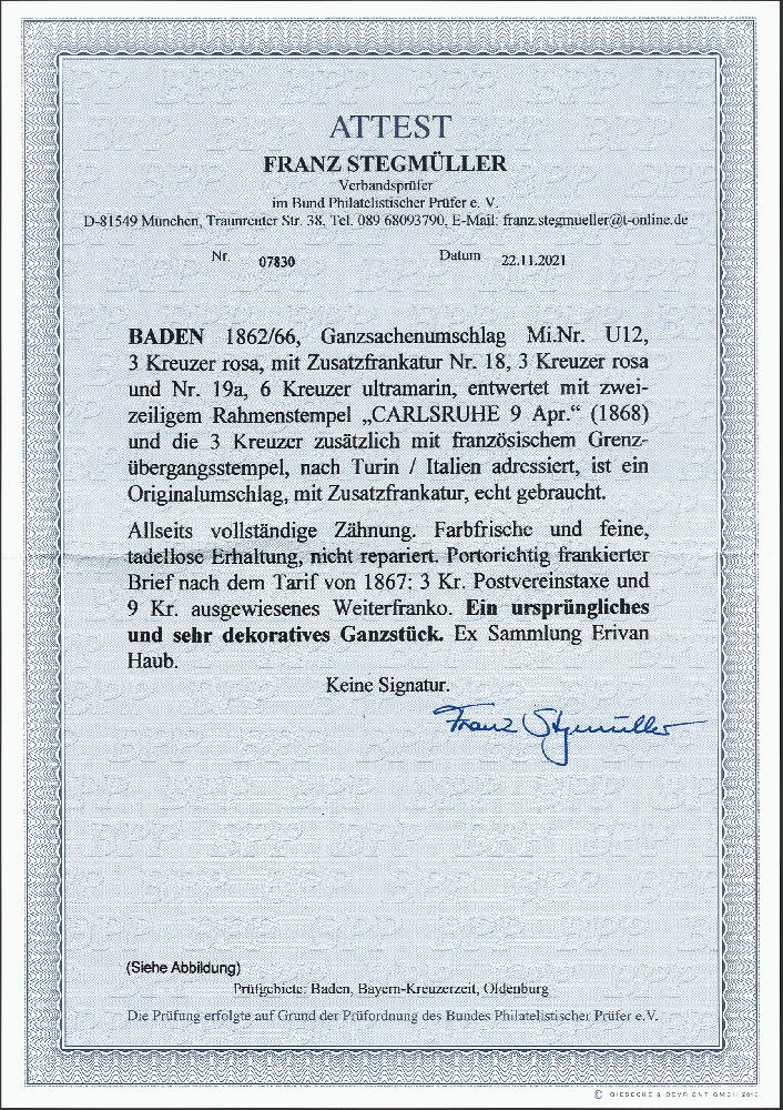 | Zusatzinformationen und Suchstichworte: | 378. Auktion Heinrich Köhler Auktionstermin 21.-26. März 2022 Los 10 1862/66, Ganzsachenumschlag 3 Kreuzer rosa mit Zufrankatur 3 Kreuzer rosa und 6 Kreuzer ultramarin, beide farbfrisch und einwandfrei gezähnt, mit sauber aufgesetztem Rahmenstempel "CARLSRUHE 9. Apr." (1868) nach Turin im Königreich Italien. Der Brief ist portogerecht frankiert mit 3 Kreuzern Postvereinstaxe und 9 Kreuzern ausgewiesenem Weiterfranko. Ein attraktiver Brief in tadelloser Erhaltung. Fotoattest Stegmüller BPP (2021) Ausruf 300,00 EUR Zuschlag 700,00 EUR (aus der Sammlung Erivan Haub) |