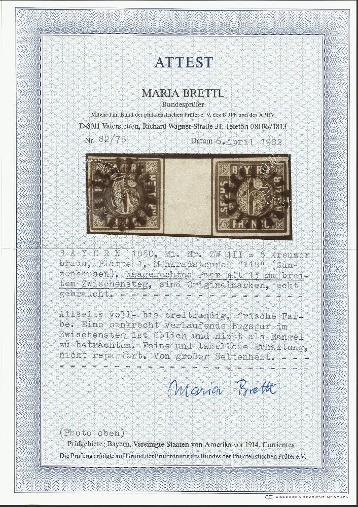 | Zusatzinformationen und Suchstichworte: | 378. Auktion Heinrich Köhler Auktionstermin 21.-26. März 2022 Los 15 6 Kreuzer rötlichbraun im waagerechten Zwischenstegpaar, sogenannte ‚Brücke‘, farbfrisch und voll-bis breitrandig, sauber entwertet durch gMR „118“ GUNZENHAUSEN. Übliche leichte Faltung im Steg, sonst tadellos. Gebrauchte Zwischenstegpaare gehören zu den großen Seltenheiten der Bayern-Philatelie. Signiert Carl H. Lange mit Befund (1957), Fotoatteste Brettl BPP (1982) und Stegmüller BPP (2021) Ausruf 8.000,00 EUR Zuschlag 13.500,00 EUR (aus der Sammlung Erivan Haub) |
