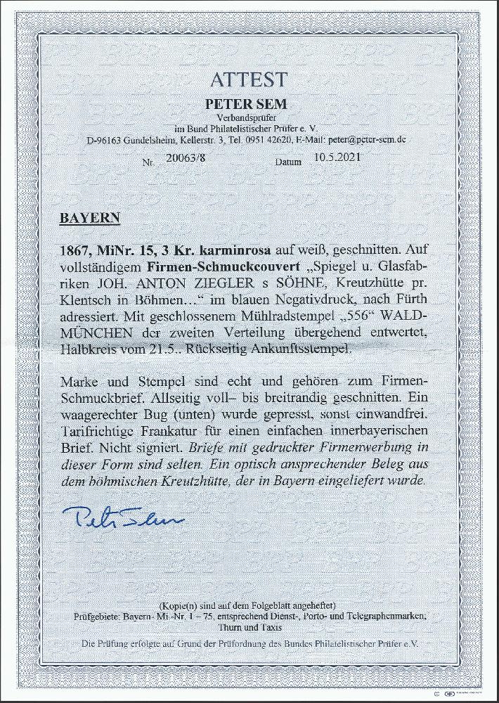 | Zusatzinformationen und Suchstichworte: | 378. Auktion Heinrich Köhler Auktionstermin 21.-26. März 2022 Los 21 3 Kreuzer kaminrosa, allseits breitrandig und farbfrisch, mit sauber aufgesetztem gMR „556“ und nebengesetztem Halbkreis „WALDMÜNCHEN 21/5“ auf dekorativ bedrucktem Werbe-Kuvert der Spiegel- und Glasfabriken ‚JOH. ANTON ZIEGLERs SÖHNE‘ nach Fürth mit Ankunftsstempel. Ein Briefbug, durch das untere Viertel der Marke verlaufend, wurde unauffällig geglättet. Ein sehr dekoratives Stück. Fotoattest Sem BPP (2021) Ausruf 200,00 EUR Zuschlag 1.350,00 EUR (aus der Sammlung Erivan Haub) |