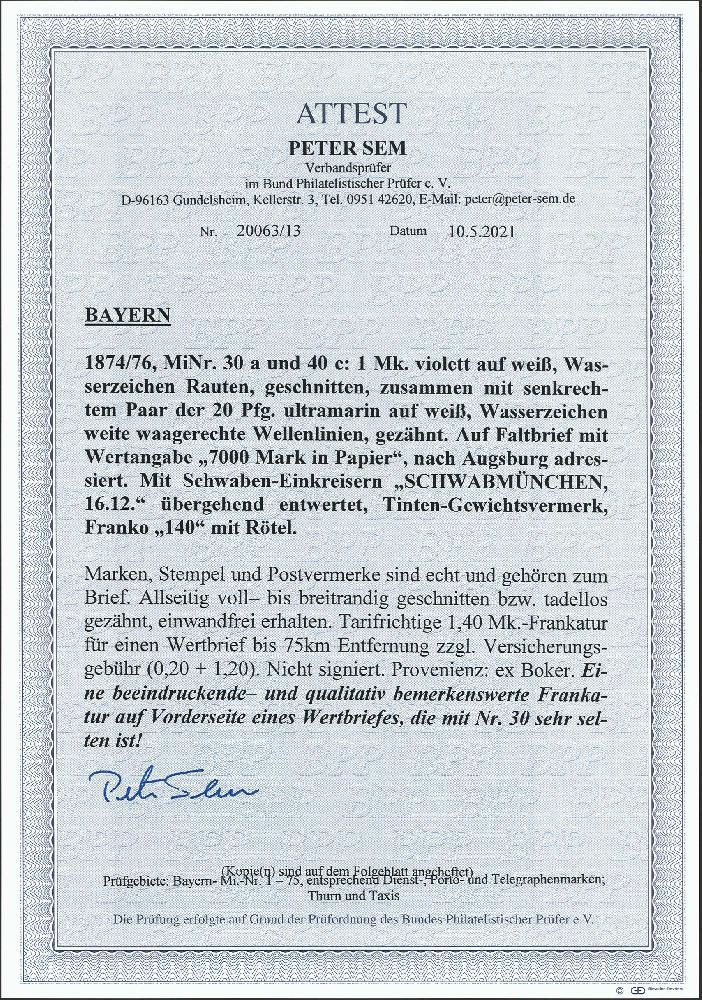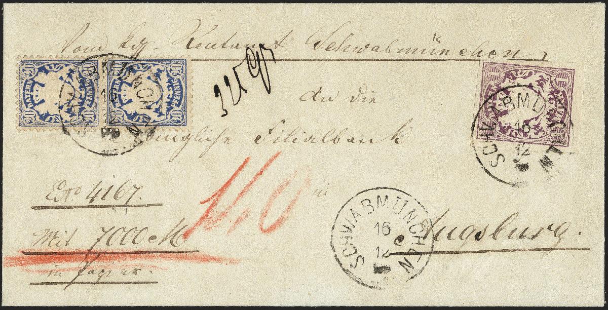 | Zusatzinformationen und Suchstichworte: | 378. Auktion Heinrich Köhler Auktionstermin 21.-26. März 2022 Los 25 1 Mark violett, farbfrisch und allseits breitrandig, zusammen mit senkrechtem Paar 20 Pfennig ultramarin, vorderseitig auf komplettem Wertbrief (ursprünglich mit 7000 Mark in Banknoten) von „SCHWABMÜNCHEN 16 12“ nach Augsburg. Sehr schöne und einwandfreie Erhaltung. Eine außerordentlich seltene vorderseitige Frankatur. Fotoattest Sem BPP (2021) Ausruf 3.000,00 EUR Zuschlag 9.500,00 EUR (aus der Sammlung Erivan Haub) |