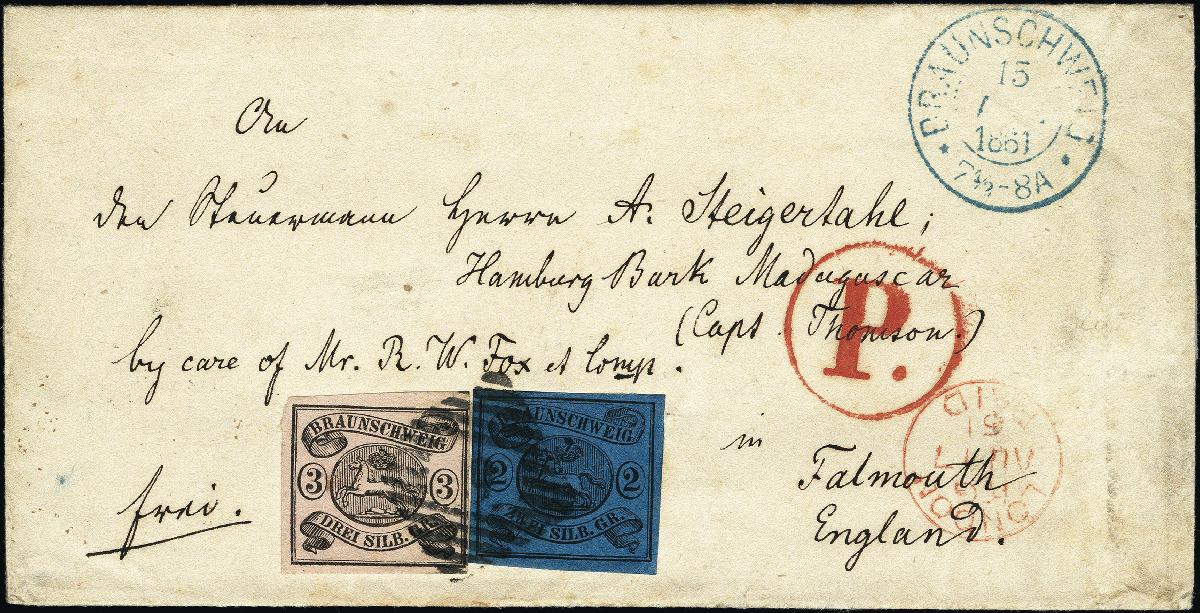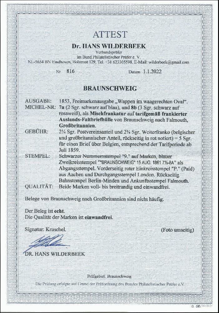 | Zusatzinformationen und Suchstichworte: | 378. Auktion Heinrich Köhler Auktionstermin 21.-26. März 2022 Los 29 1853, 3 Silbergroschen schwarz auf rosaweiß und 2 Silbergroschen schwarz auf blau, beide farbfrisch und voll- bis breitrandig mit sauber aufgesetzter Nr. „9“ und nebengesetztem blauen Doppelkreisstempel „BRAUNSCHWEIG 15 AUG. 1861“ auf Briefhülle über Aachen und Belgien nach Falmouth, England. Der Brief ist portogerecht frankiert nach dem neuen Tarif von 1859 mit 2¼ Silbergroschen Postvereinsanteil und 2¾ Silbergroschen Weiterfranko, letzteres rückseitig notiert. Ein attraktiver und seltener Auslandsbrief. Signiert Kruschel und Fotoattest Dr. Wilderbeek BPP (2022) Ausruf 800,00 EUR Zuschlag 5.800,00 EUR (aus der Sammlung Erivan Haub) |