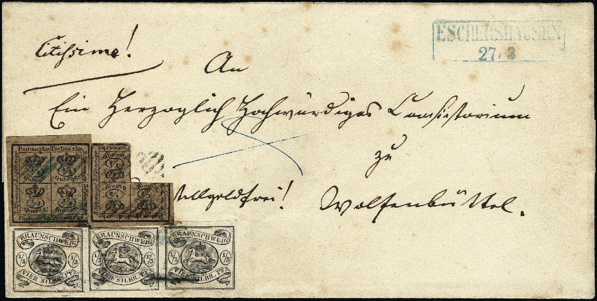 | Zusatzinformationen und Suchstichworte: | 378. Auktion Heinrich Köhler Auktionstermin 21.-26. März 2022 Los 30 ⅓ Silbergroschen schwarz im waagerechten Dreierstreifen, in Mischfrankatur mit teilbarer Inlandsmarke 4/4 Gutegroschen und 3/4 Gutegroschen schwarz auf gelbbraun, alle noch voll- bis breitrandig, die vollständige Inlandsmarke vom oberen Bogenrand stammend, mit Nr. „12“ und nebengesetztem blauem Rahmenstempel „ESCHERSHAUSEN 27/3“ als portogerechte 30 Gutepfennig-Frankatur auf Briefhülle der 3. Gewichtsstufe nach Wolfenbüttel mit Ankunfts- und Ausgabestempel. Außerhalb der Frankatur einige kleine Stockfleckchen, sonst einwandfrei. Die wohl spektakulärste Mischfrankatur Braunschweigs. Fotoattest Dr. Wilderbeek BPP (2022) Ausruf 5.000,00 EUR Zuschlag 28.000,00 EUR (aus der Sammlung Erivan Haub) |