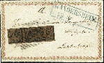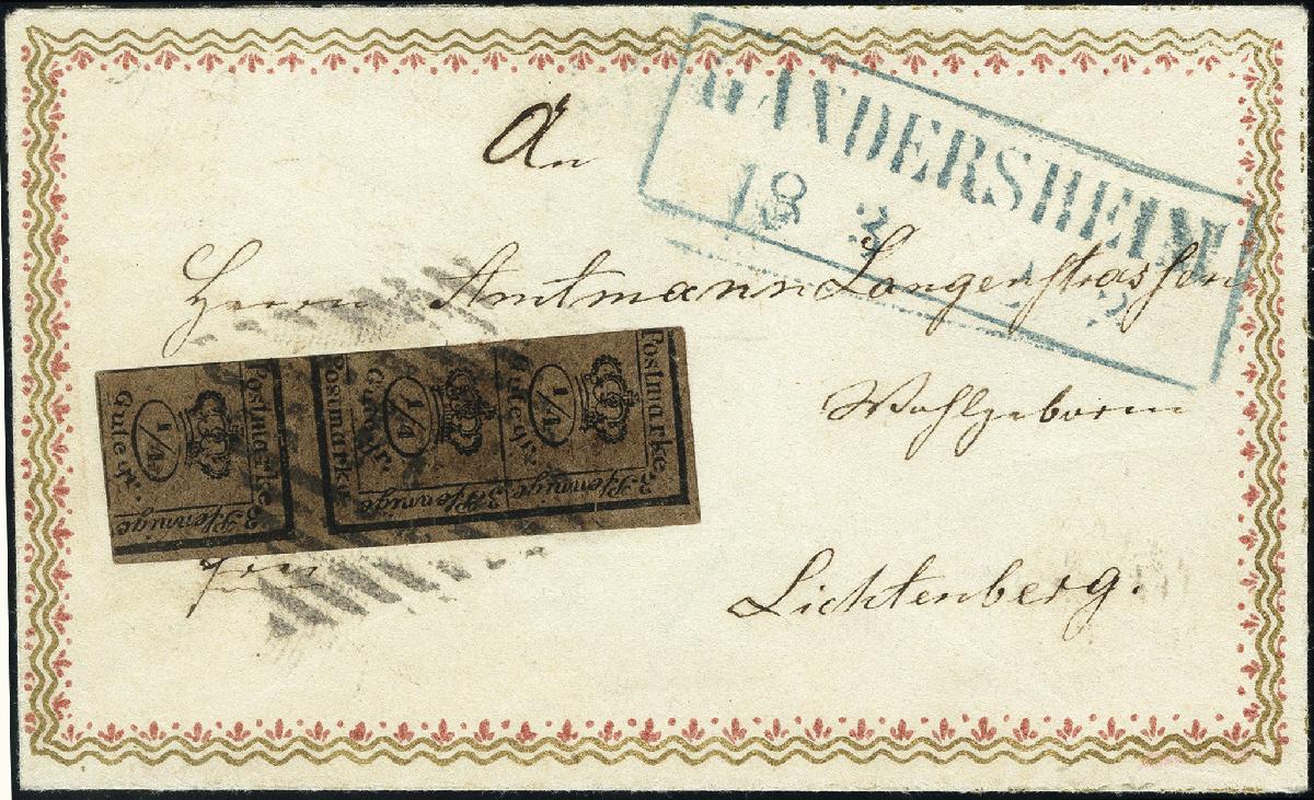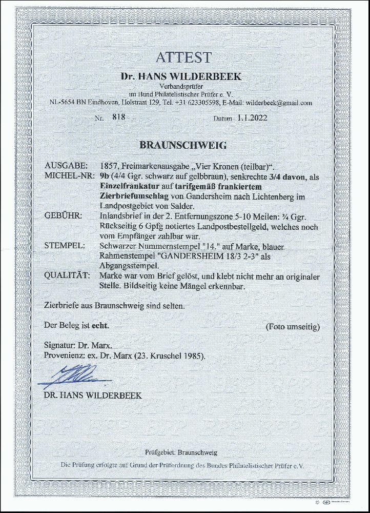 | Zusatzinformationen und Suchstichworte: | 378. Auktion Heinrich Köhler Auktionstermin 21.-26. März 2022 Los 31 Teilbare Inlandsmarke 3/4 Gutegroschen schwarz auf gelbbraun, farbfrisch und voll- bis breitrandig, mit Nr. „14“ und sauber nebengesetztem blauem Rahmenstempel „GANDERSHEIM 18/3“ auf kleinem Damenbrief mit in Gold und Rot bedruckter Zierborde nach Lichtenberg im Landpostgebiet von Salder mit rückseitig notiertem Landpost-Bestellgeld. Die Frankatur war gelöst und ist nicht ganz korrekt replatziert; keine Mängel erkennbar. Ein attraktiver und seltener kleiner Zierbrief. Fotoattest Dr. Wilderbeek BPP (2022) Ausruf 500,00 EUR Zuschlag 1.100,00 EUR (aus der Sammlung Erivan Haub) |
