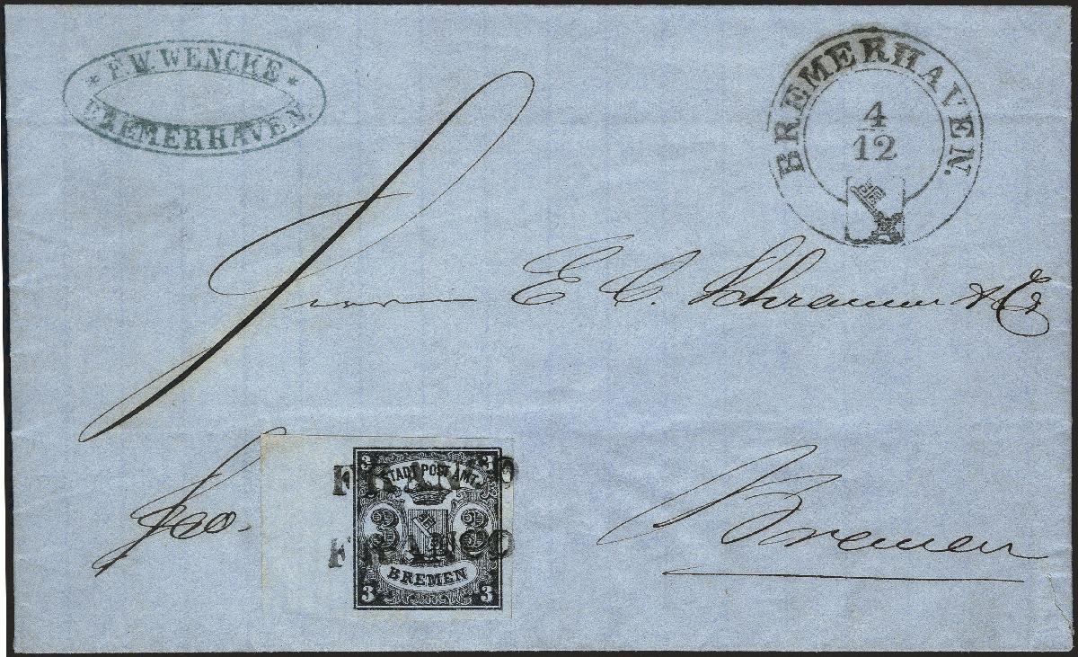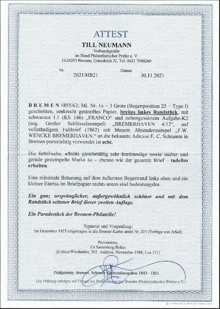 | Zusatzinformationen und Suchstichworte: | 378. Auktion Heinrich Köhler Auktionstermin 21.-26. März 2022 Los 41 1855, 3 Grote schwarz auf blaugrau, senkrecht gestreiftes Papier, allseits breitbandiges linkes Randstück mit ca. 11 Millimeter Bogenrand, mit zweimal parallel zueinander abgeschlagenem Langstempel „FRANCO“ auf komplettem Faltbrief mit geradezu ideal nebengesetztem großem Schlüsselstempel „BREMERHAVEN 4/12“ nach Bremen. Sehr schöne frische und tadellose Erhaltung (eine minimale Bräunung auf dem äußersten Bogenrand links oben und ein minimaler Einriss im Briefpapier sind bedeutungslos). Gebrauchte Randstücke von Bremen sind große Seltenheiten; mit einem Rand in dieser Größe haben wir nur ein weiteres Stück registriert. Ein Brief der - wie Volker Parthen zu sagen pflegte - ‘alle Sprachen spricht‘. Fotoattest Neumann BPP (2021) Ausruf 8.000,00 EUR Zuschlag 50.000,00 EUR (aus der Sammlung Erivan Haub) |