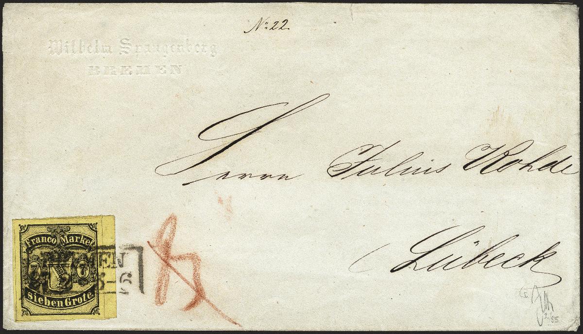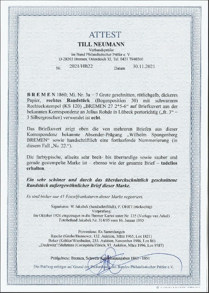 | Zusatzinformationen und Suchstichworte: | 378. Auktion Heinrich Köhler Auktionstermin 21.-26. März 2022 Los 42 7 Grote schwarz auf rötlichgelb, dickeres Papier, allseits außergewöhnlich breitbandiges rechtes Randstück mit fast vollständigen Zwischenlinien und rechts ca. 3,5 mm Bogenrand, mit sauber übergehend aufgesetztem Rahmenstempel „BREMEN 27 2“ auf Briefkuvert mit geprägter Absenderadresse „Wilhelm Spangenberg BREMEN“ nach Lübeck. Sehr schöne frische und tadellose Erhaltung; wohl einer der schönsten Briefe mit dieser Marke. Rückseitig größerer Signatur von Paul Ohrt, signiert Jakubek mit Befund (1995) und Fotoattest Neumann BPP (2021) Ausruf 5.000,00 EUR Zuschlag 18.000,00 EUR (aus der Sammlung Erivan Haub) |