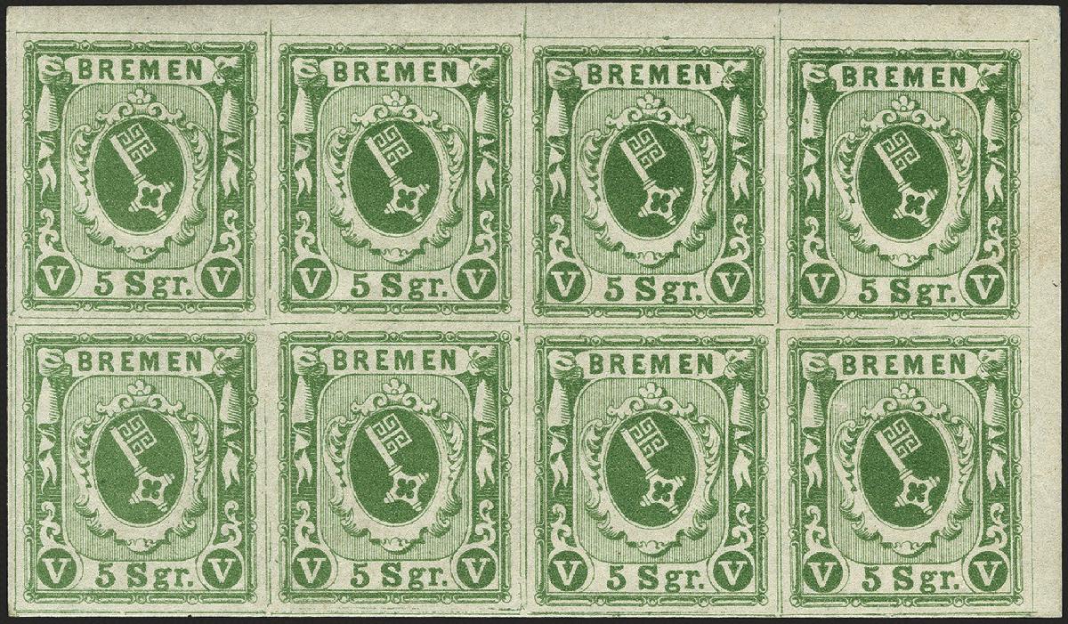 | Zusatzinformationen und Suchstichworte: | 378. Auktion Heinrich Köhler Auktionstermin 21.-26. März 2022 Los 43 5 Silbergroschen gelbgrün, waagerechter Achterblock aus der rechten oberen Bogenecke, farbfrisch und allseits sehr breitrandig, oben und rechts mit ca. 2/2,5 mm Bogenrand, postfrisch in tadelloser und sehr frischer Erhaltung. Eine schöne Einheit der 1. Auflage. Ein Wert signiert Koch, Fotoattest Bremer Verein (1967) und Fotoattest Neumann BPP (2021) Ausruf 1.500,00 EUR Zuschlag 3.200,00 EUR (aus der Sammlung Erivan Haub) |