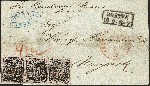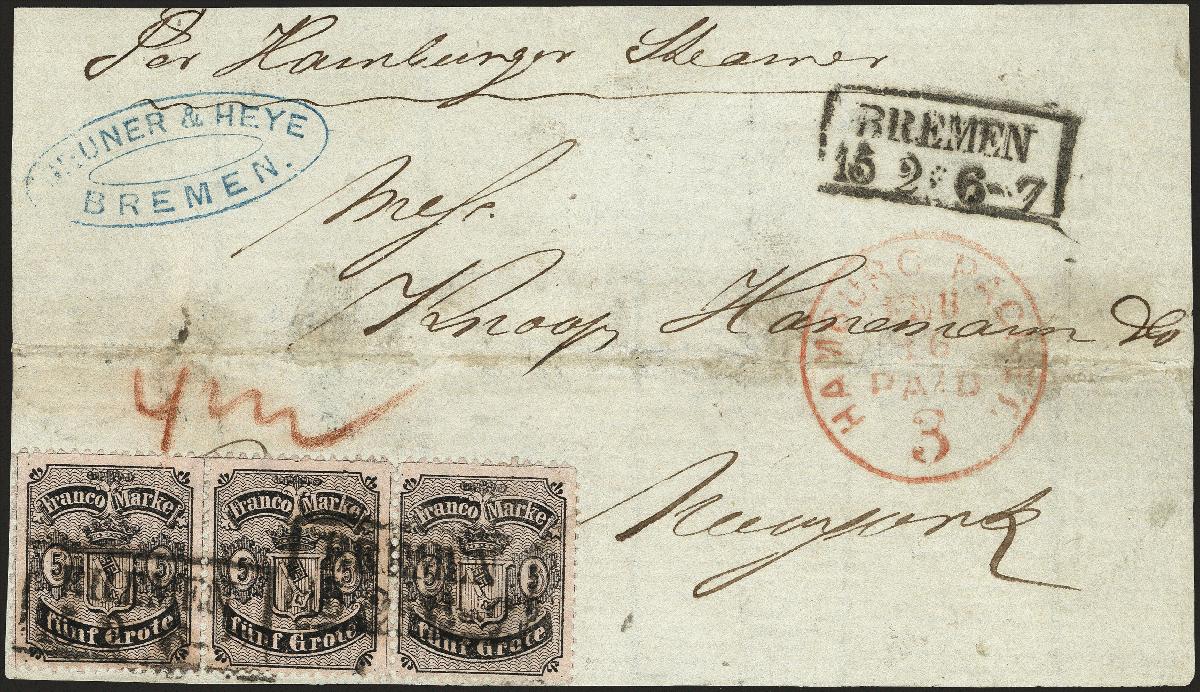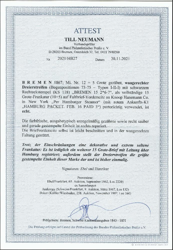 | Zusatzinformationen und Suchstichworte: | 378. Auktion Heinrich Köhler Auktionstermin 21.-26. März 2022 Los 47 5 Grote schwarz auf matkarmingrau im waagerechten Dreierstreifen, farbfrisch mit ausgabetypisch etwas unregelmäßiger Zähnung, am rechten Rand repariert, sonst einwandfrei, mit sauber auf- und nebengesetztem Rahmenstempel „BREMEN 15 2“ auf Briefvorderseite (im Format leicht beschnitten) mit Leitvermerk „Per Hamburger Steamer“ und vorderseitigem rotem „HAMBURG PACKET FEB 16 PAID 3“ nach New York. Größte bekannte gebrauchte Einheit dieser Marke und als solche Unikat, darüber hinaus ist nur ein weiterer 15 Grote-Brief mit Leitung über Hamburg registriert. Ein nicht nur postgeschichtlich hochinteressantes Stück. Signiert Ebel und Hunziker, Fotoattest Neumann BPP (2021) Ausruf 4.000,00 EUR Zuschlag 12.500,00 EUR (aus der Sammlung Erivan Haub) |