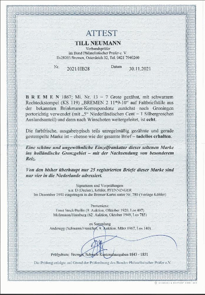| Zusatzinformationen und Suchstichworte: | 378. Auktion Heinrich Köhler Auktionstermin 21.-26. März 2022 Los 50 7 Grote schwarz auf gelb, farbfrisch und gut gezähnt (ausgabetypisch teils unregelmäßig) mit Rahmenstempel „BREMEN 2 11“ (1867) auf Briefhülle der bekannten Brinkmann-Korrespondenz nach Groningen und nachgesandt nach Winschoten. Der niederländische Portoanteil ist mit „5“ Cent in Rötel vermerkt. Eine sehr schöner und tadelloser Brief mit der seltenen Marke. Signiert Köhler, Decker und Pfenninger, Fotoatteste Engel BPP (1978) und Neumann BPP (2021). Ausruf 10.000,00 EUR Zuschlag 17.000,00 EUR (aus der Sammlung Erivan Haub) |